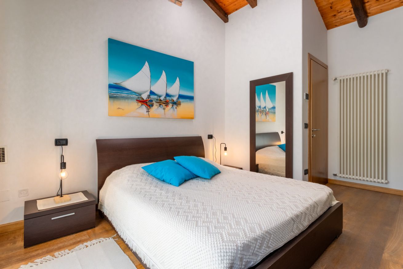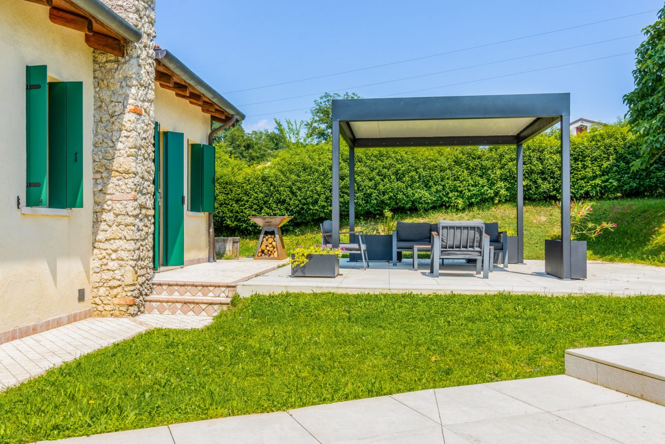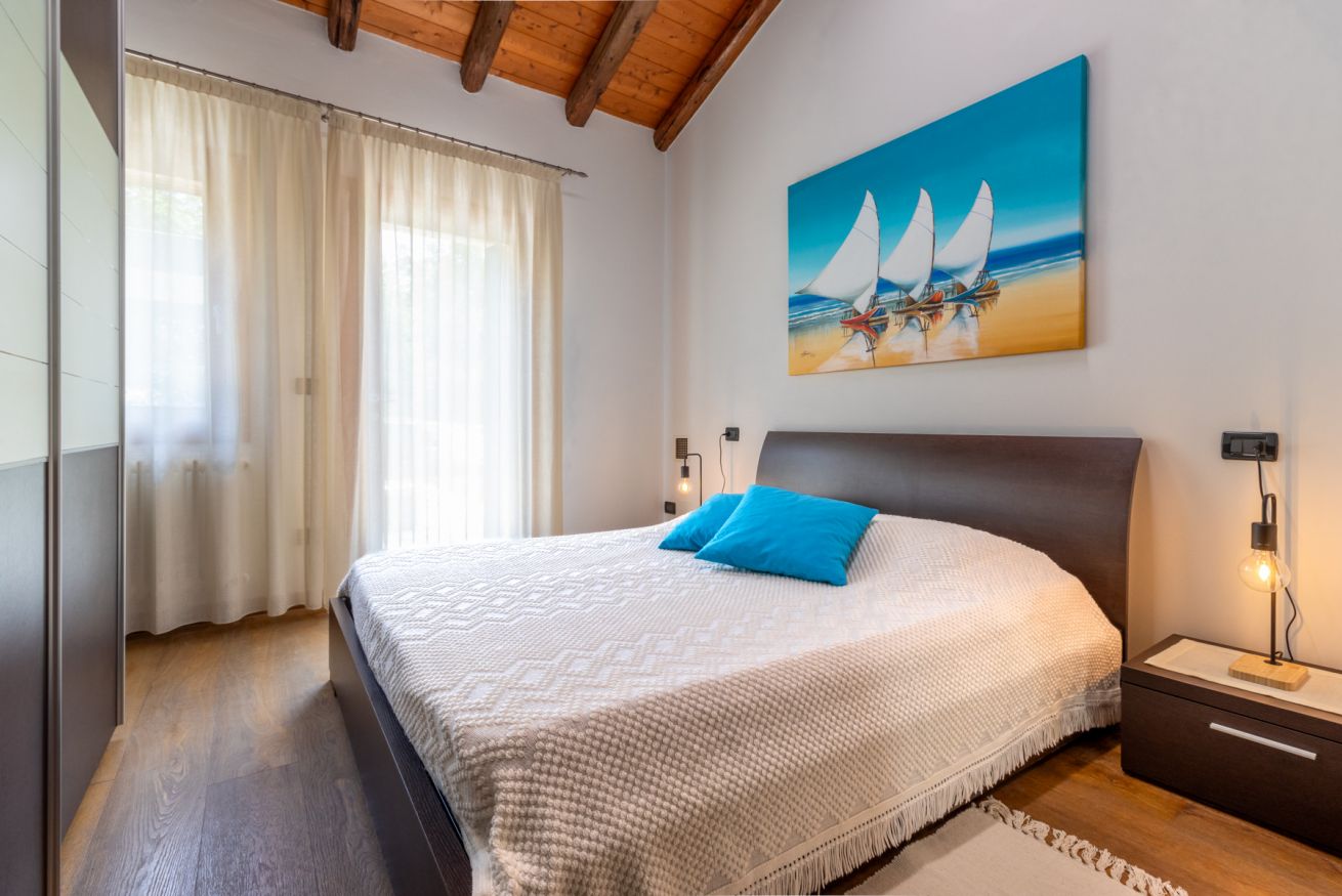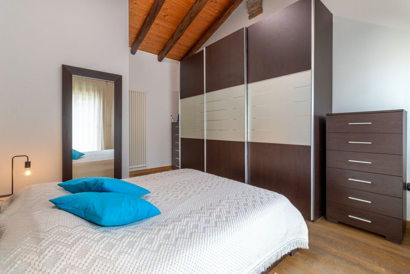Completano l'appartamento un bagno finestrato con doccia e lavatrice e un'ampia camera matrimoniale con porta finestra che conduce al bellissimo giardino e patio esterno composto da barbecue, tavolino con divanetto e sedie dove poter gustare un buon calice di Prosecco e ammirare il panorama circostante.
