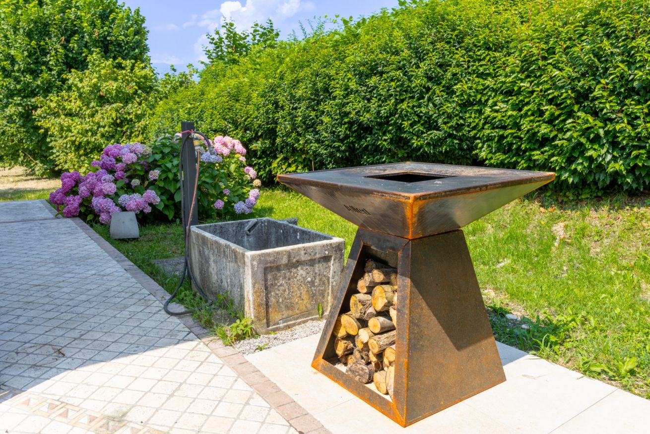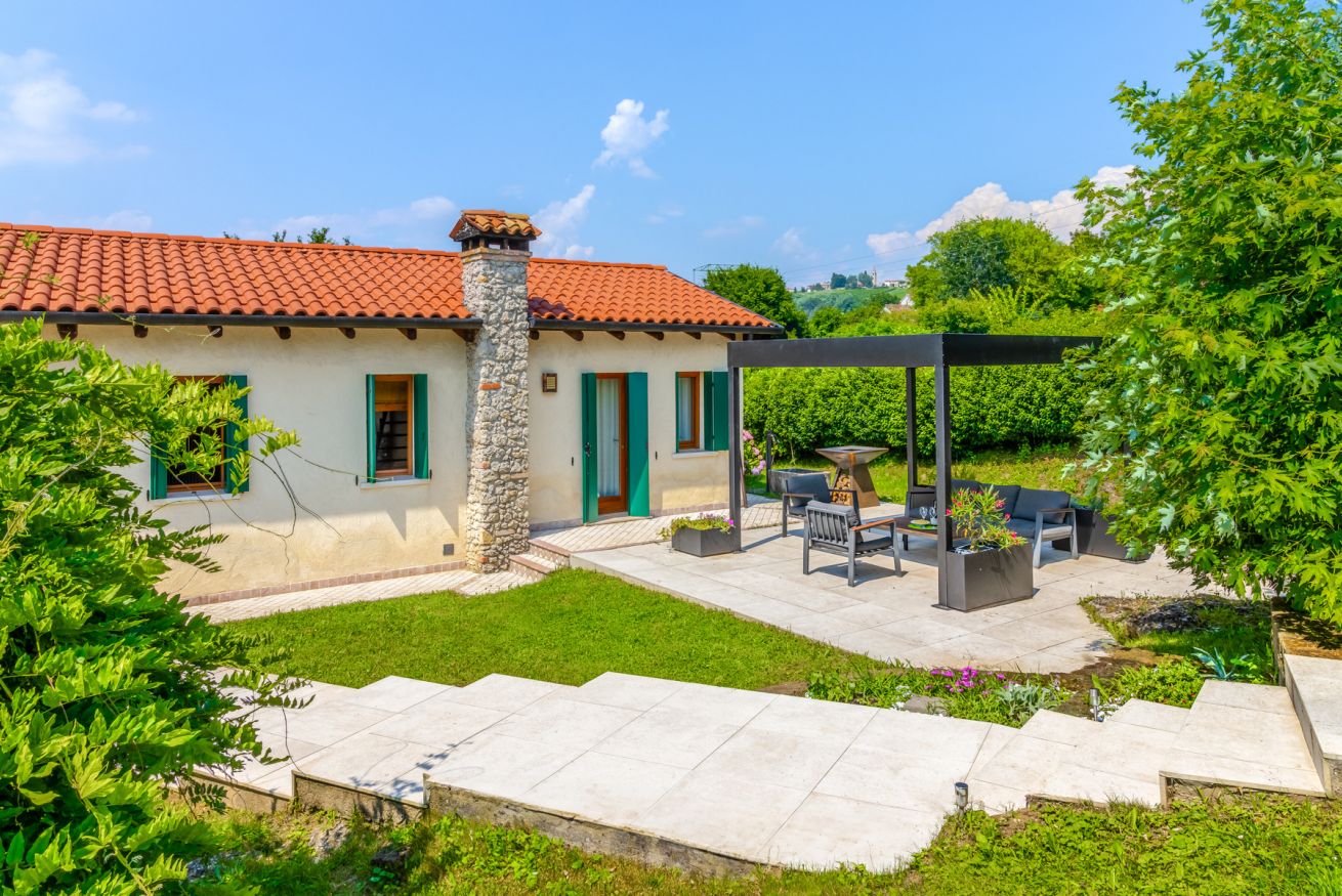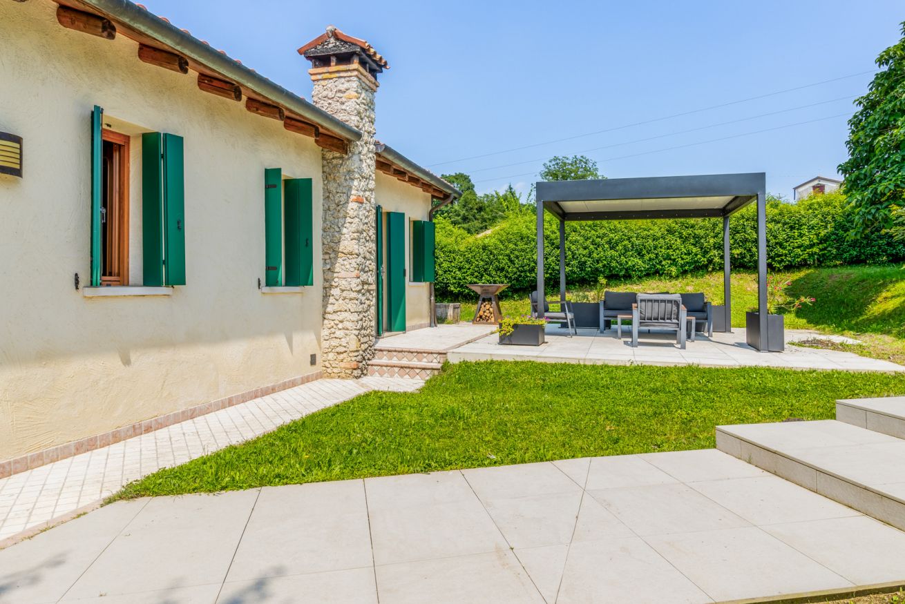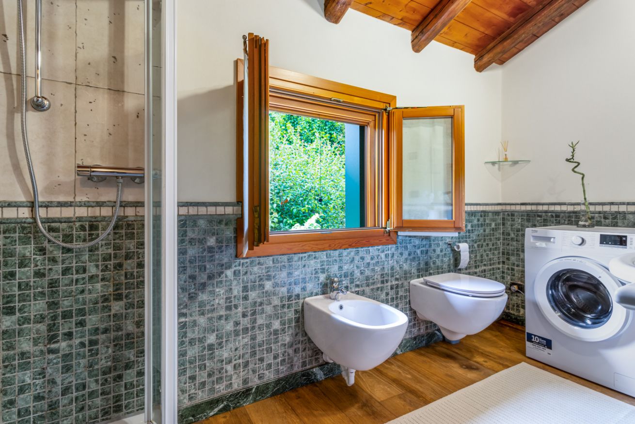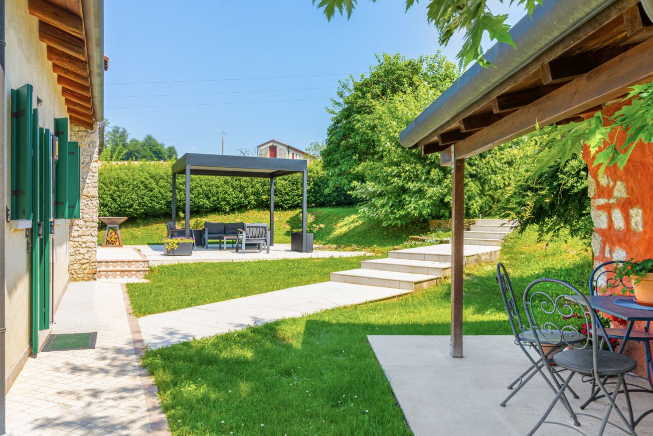 Completano l'appartamento un bagno finestrato con doccia e lavatrice e un'ampia camera matrimoniale con porta finestra che conduce al bellissimo giardino e patio esterno composto da barbecue, tavolino con divanetto e sedie dove poter gustare un buon calice di Prosecco e ammirare il panorama circostante.