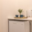 La camera dispone di bagno privato finestrato, TV, frigobar e set di cortesia con bollitore, tazze, tisane e caffè solubile.