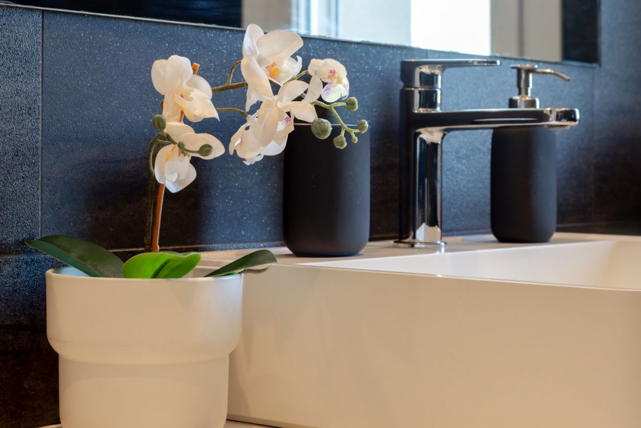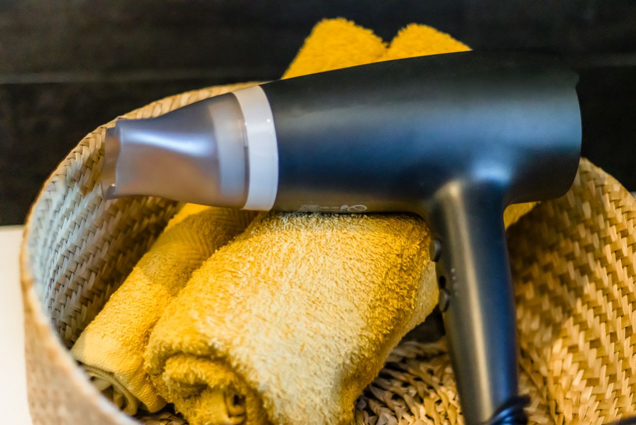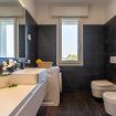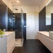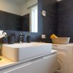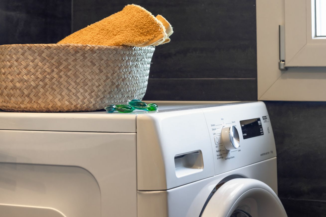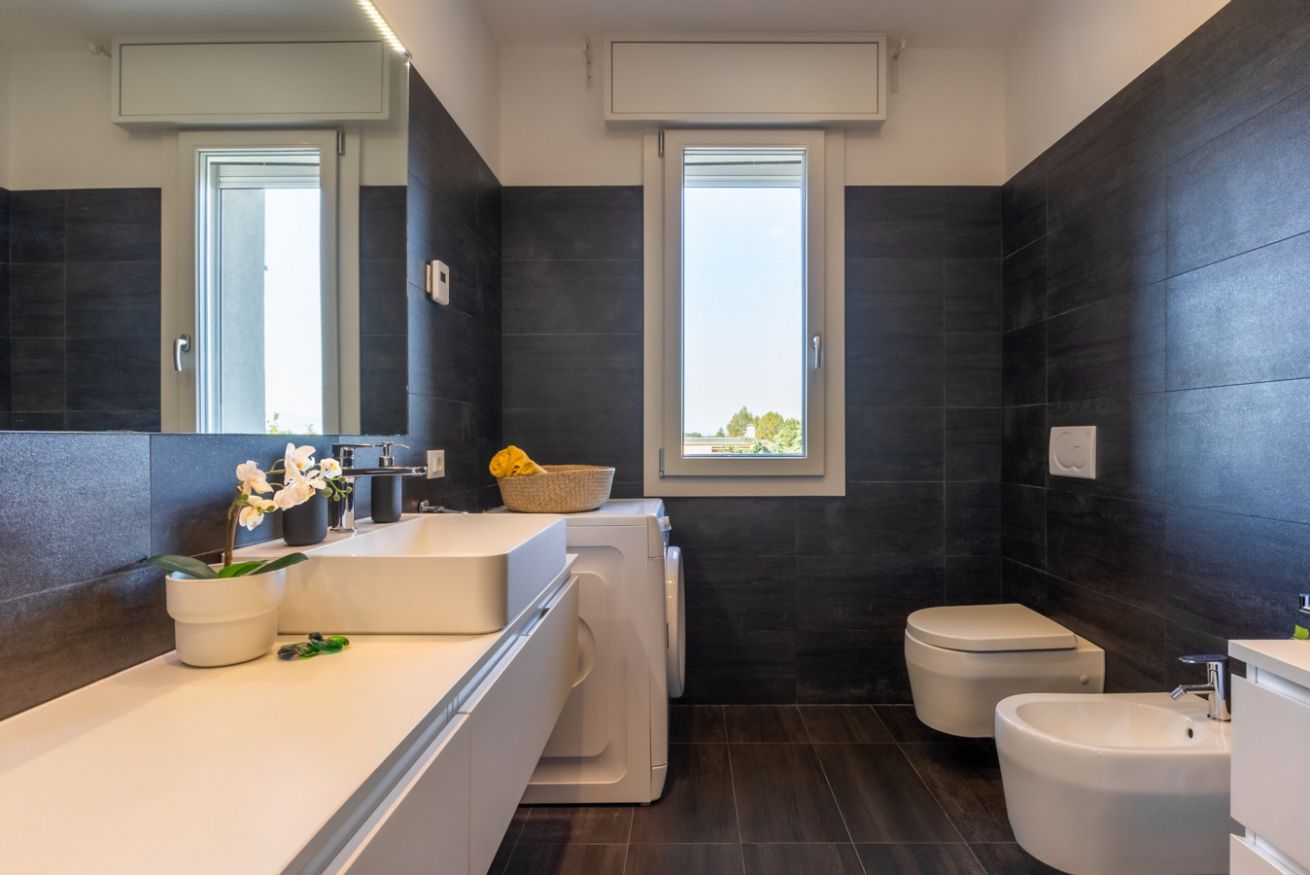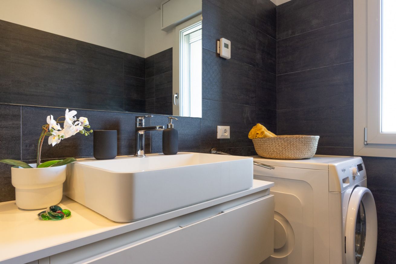 Un bagno moderno con doccia e lavatrice, ideale per soggiorni più lunghi.