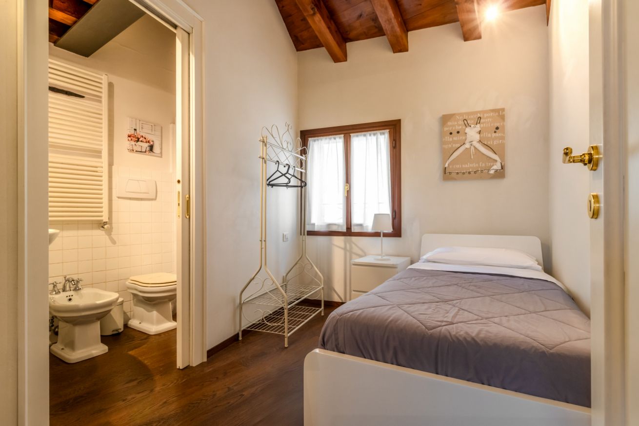 una deliziosa camera singola con bagno privato e doccia, ideale anche per chi viaggia da solo o per lavoro.